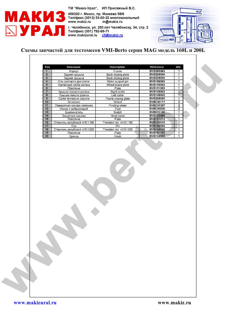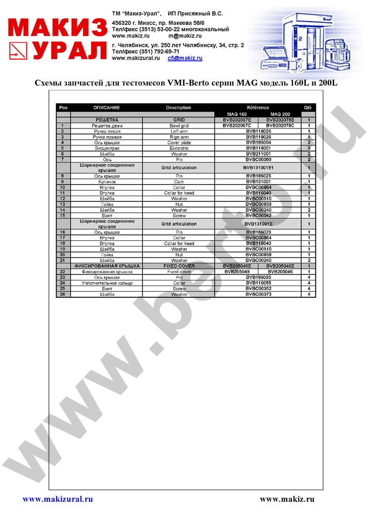 Схемы запчастей для тестомесов VMI-Berto Италия серии MAG модель 160L и 200L